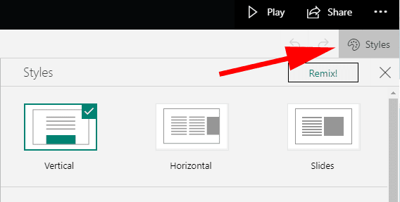 Si no se siente inspirado, seleccione el botón Remix para permitir que (Remix)Sway elija el diseño y el diseño por usted.