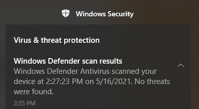 Eso activará el Antivirus de Microsoft Defender(Microsoft Defender Antivirus) para escanear toda su computadora en busca de malware, virus y otras formas de amenazas. Cuando finalice el análisis, recibirá una notificación de seguridad de Windows(Windows Security) en el área de notificación o en el Centro de actividades de Windows(Windows Action Center) .