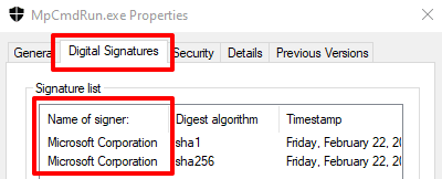 Microsoft es el creador y desarrollador de Malware Protection Command Line Utility . Si MpCmdRun.exe está en otro directorio (que no sea C:Program FilesWindows Defender ), debe verificar la firma digital del archivo. Eso lo ayudará a confirmar si MpCmdRun.exe en su PC es malicioso o si tal vez se movió a otra carpeta por accidente.