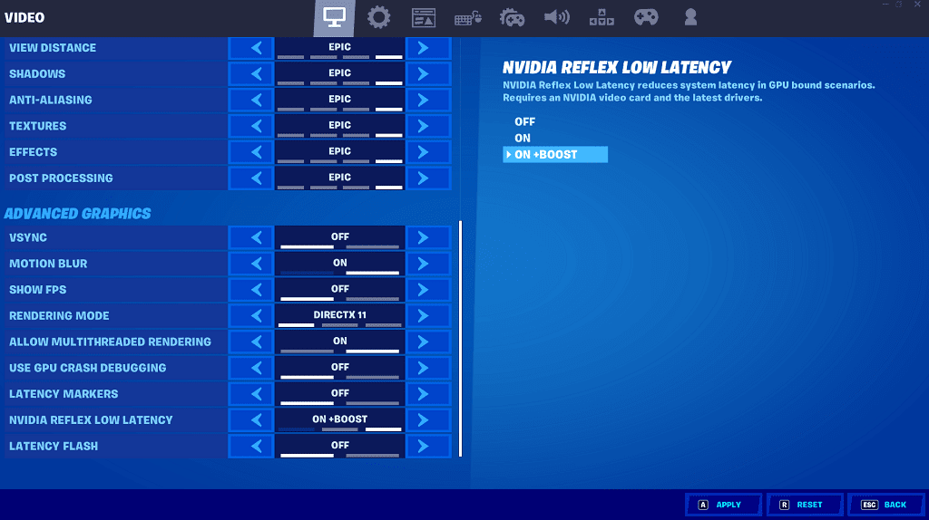 - Cambie Nvidia Reflex Low Latency a On + Boost y luego presione A para aplicar.