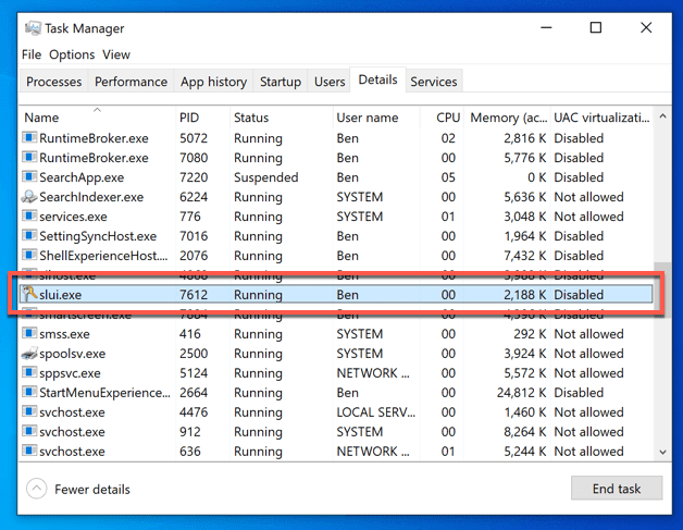 Identificación del proceso Slui.exe en el Administrador de tareas(Identifying the Slui.exe Process in Task Manager)