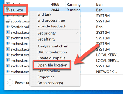 - En la ventana Administrador de tareas(Task Manager) , busque Activación(Windows Activation ) de Windows o Cliente(Windows Activation Client ) de activación de Windows en la pestaña Procesos . (Processes)Como alternativa, localice slui.exe en la pestaña Detalles . (Details)Haga clic derecho en(Right-click) la entrada, luego seleccione Abrir ubicación de archivo(Open file location) para abrir la carpeta que contiene slui.exe en una nueva ventana del Explorador de archivos .(File Explorer)