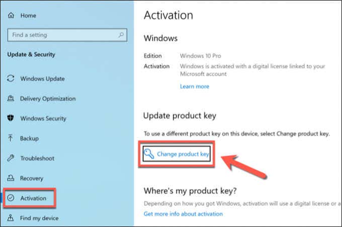 - En el menú Configuración , seleccione (Settings)Actualización y seguridad(Update & Security ) > Activación(Activation) . El menú Activación(Activation) cambiará de apariencia, dependiendo de si tiene una licencia genuina instalada y activada o no. Por ejemplo, para cambiar su clave (y ejecutar el proceso slui.exe), seleccione la opción Cambiar clave de producto .(Change product key)
