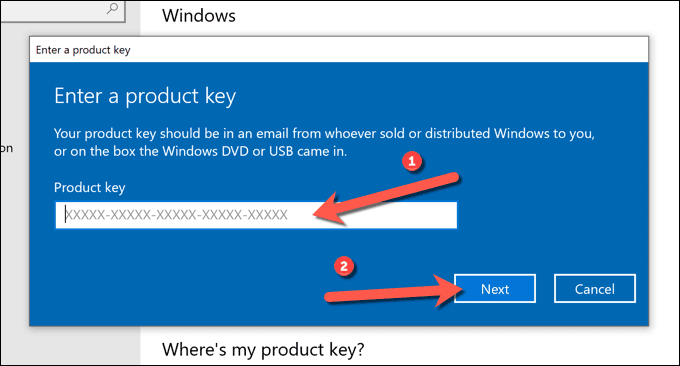 - En el cuadro Ingresar una clave de producto(Enter a product key) , escriba una nueva clave de licencia de Windows 10 y seleccione (Windows 10)Siguiente(Next) para continuar, luego siga las instrucciones adicionales en pantalla para completar el proceso.