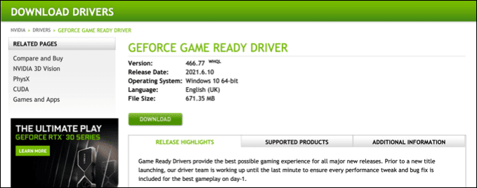 Si tiene una tarjeta gráfica NVIDIA , por ejemplo, deberá actualizar sus controladores NVIDIA(update your NVIDIA drivers) visitando el sitio web de NVIDIA , descargando el controlador más reciente manualmente e instalándolo en su PC.