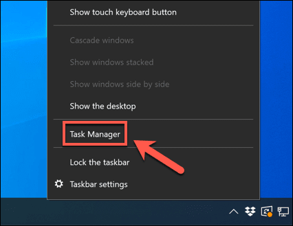 - Para hacer esto, deberá abrir el Administrador de tareas de Windows(Windows Task Manager) haciendo clic con el botón derecho en la barra de tareas en la parte inferior de la pantalla. En el menú de opciones, presiona Administrador de tareas(Task Manager) . Alternativamente, presione Ctrl + Shift + Esc en su teclado para abrirlo manualmente.