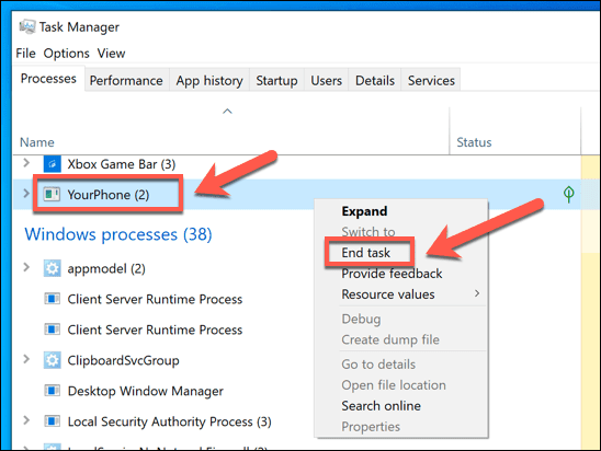 Si cree que el proceso yourphone.exe se está ejecutando en su PC y desea detenerlo, puede hacerlo manualmente mediante el Administrador de tareas de Windows(Windows Task Manager) .