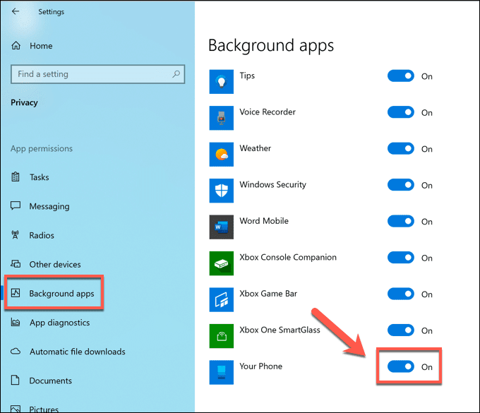 - En el menú Configuración de la ventana(Window Settings ) , presione Privacy > Background apps . Desde aquí, aparecerá una lista de aplicaciones que pueden ejecutarse en segundo plano. Localice la aplicación Your Phone desplazándose por la lista de la derecha. Para desactivarlo, haga clic en el control deslizante junto a él en la posición Desactivado(Off) .