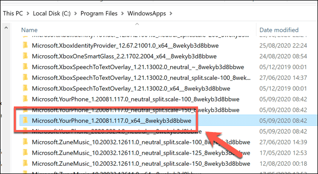 - En la carpeta C:Program FilesWindowsApps , busque una carpeta adicional que comience con Microsoft.YourPhone (por ejemplo, Microsoft.YourPhone_1.20081.117.0_x64__8wekyb3d8bbwe ). El nombre de la carpeta cambiará, según la versión de la aplicación instalada actualmente en su PC. Es posible que aparezcan varias carpetas con la etiqueta Microsoft.YourPhone , así que busque la carpeta que contiene la etiqueta de arquitectura del sistema (por ejemplo, x64 ).
