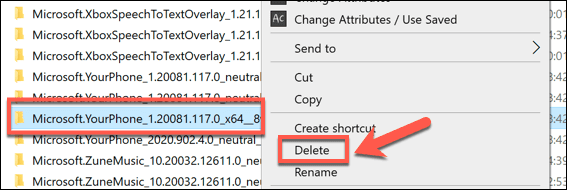 - Para eliminar la carpeta, haga clic con el botón derecho en ella y presione Eliminar(Delete) . Esto eliminará todos los archivos de la aplicación Your Phone , incluido el archivo yourphone.exe.
