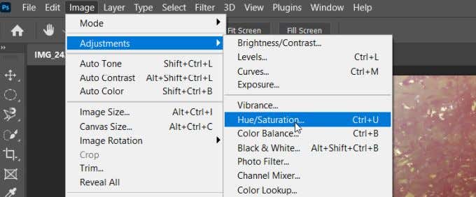 Primero seleccione la capa superpuesta y luego vaya a Imagen(Imagen) > Ajustes(Correcciones) > La saturación de color . Esto creará una capa de ajuste para su superposición. Debería aparecer una ventana donde puede ajustar el color de la capa con el control deslizante Tono.(eh)