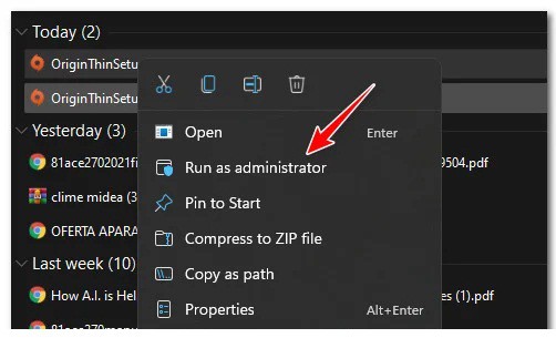 - Cuando se haya descargado el instalador, debes navegar hasta las ubicaciones donde se descargó (carpeta Descargas), haz clic con el botón derecho en él y haz clic en Ejecutar como administrador en el menú contextual.