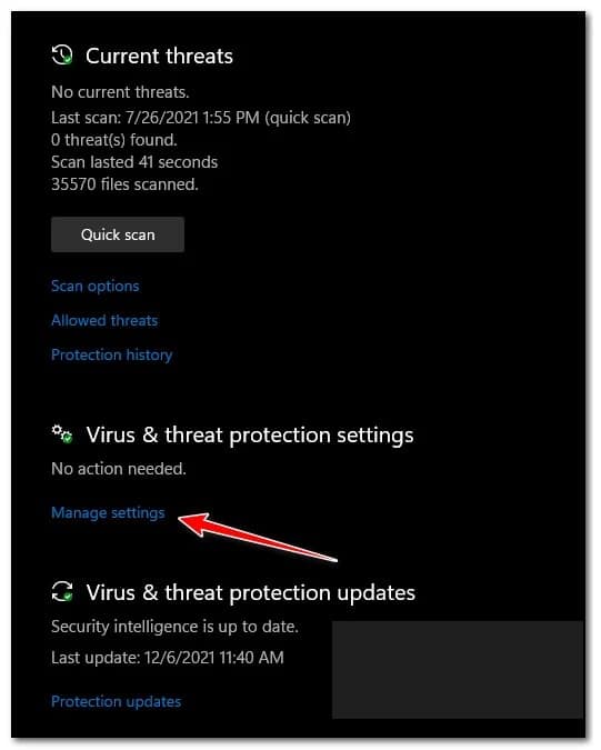 - A continuación, desplázate hacia abajo hasta la configuración de protección contra virus y amenazas y haz clic en Administrar configuración en el menú contextual.