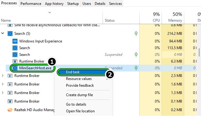 Termina el proceso de MiniSearchHost en el Administrador de tareas del sistema