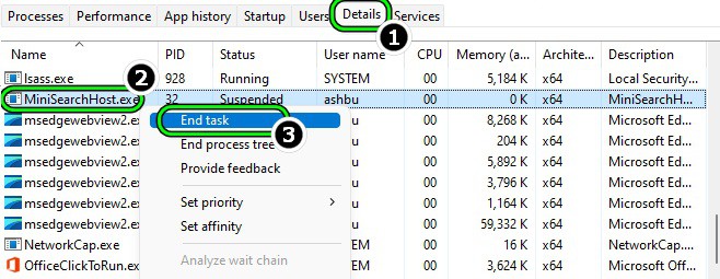 - Ahora busca y haz clic derecho en el proceso MiniSearchHost (puedes encontrarlo en Buscar). Si no se pudo encontrar el proceso MiniSearchHost, debes probar los pasos que mostramos más abajo.