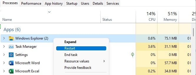 - Ahora haz clic con el botón derecho en el proceso del Explorador de Windows (puedes encontrarlo presionando la tecla W en el teclado) y selecciona Reiniciar. En caso de que te encuentres con más de un proceso del Explorador de Windows (un fenómeno bastante inusual), reinícialos todos. Si no se muestra ningún proceso del Explorador de Windows en el Administrador de tareas, sigue los pasos 4 y siguientes.