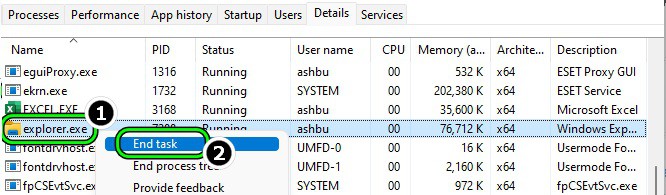 - Si el proceso del Explorador de Windows no está presente en la pestaña de procesos, cambia a la pestaña Detalles y haz clic con el botón derecho en Explorer.exe.