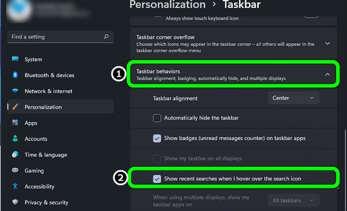 - Ahora asegúrate de expandir la opción Comportamientos de la barra de tareas y desmarca la opción de Mostrar búsquedas recientes cuando paso el mouse sobre el icono de búsqueda. Lo más probable es que algunos usuarios no puedan visualizar esta opción. Si es así, puedes probar el siguiente método.