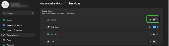 - Si eso falla, abre la Configuración de la barra de tareas y, en la sección Elementos de la barra de tareas, deshabilita Buscar.