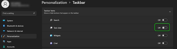 - Ahora, en la sección Elementos de la barra de tareas, deshabilita la Vista de tareas colocando el interruptor en la posición de apagado y luego verifica si la pantalla está libre del cuadro transparente.