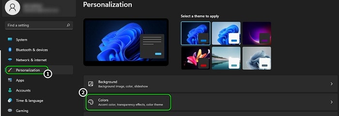 - Ahora, en el panel izquierdo de la ventana, dirígete a la pestaña Personalización y luego, en el panel derecho, abre Colores.