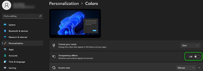 - Luego, deshabilita los efectos de transparencia colocando tu interruptor en la posición de apagado y luego, verifica si el cuadro translúcido ha desaparecido de la pantalla.