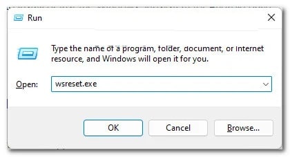 - luego escribir «wsreset.exe» dentro del cuadro de texto del indicador Correr.