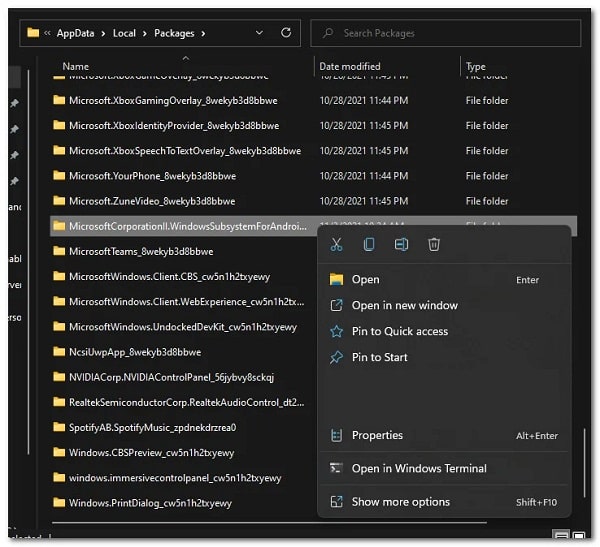 - Una vez dentro de la carpeta Paquetes, busque la carpeta Microsoft CorporationII.WindowsSubsystemForAndroid_8wekyb3d8bbwe.