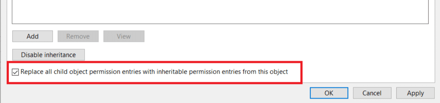 8. Marque la casilla que dice Reemplazar todas las entradas de permisos de objetos secundarios con entradas de permisos heredables de este objeto.(Replace all child object permission entries with inheritable permission entries from this object.)