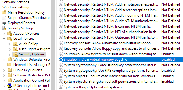 Luego ve a Configuración computadora, configuración(Configuracion de Computadora) Con ventanas, configuración(Configuración de Windows) Con seguridad(Configuraciones de seguridad) , política local(Política local) , opciones (Opciones)seguridad(seguridad) y busca Exclusión: Borrar archivo de paginación de memoria virtual(Cerrar: Borrar archivo de paginación de memoria virtual) . Asegúrate de estar allí apagado(Apagado) .