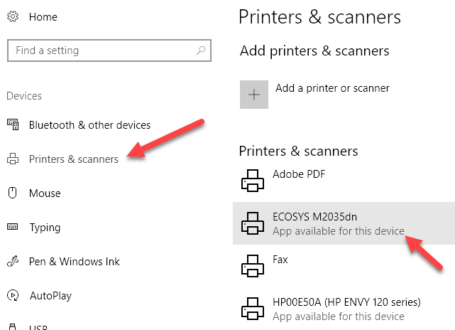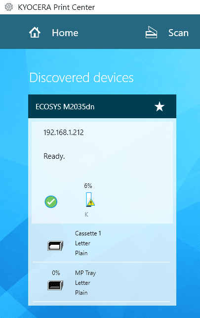 Arriba(Above) hay un ejemplo del software Kyocera Print Center ejecutándose en mi máquina con Windows 10. Le mostrará el estado de la impresora y le brindará detalles adicionales como los niveles de tinta, etc. Si no está seguro de si el software de la impresora está instalado o no en su máquina, puede verificar yendo a Configuración(Settings) , luego haciendo clic en Dispositivos(Devices) y finalmente haciendo clic en Impresoras y Escáneres(Printers & Scanners) .