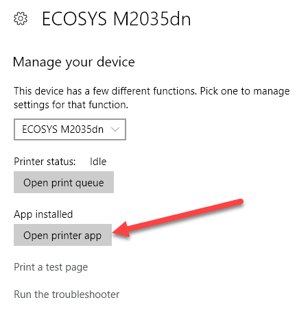 Windows 10 enumerará las impresoras en el lado derecho y, si hay un paquete de software instalado para administrar la impresora, dirá Aplicación disponible para este dispositivo(App available for this device) . Si hace clic en la impresora, luego en Administrar(Manage) , verá el botón Abrir aplicación de impresora(Open printer app) .