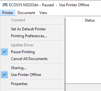 Aquí desea hacer clic en Impresora(Printer) en la barra de menú y luego asegurarse de desmarcar Pausar impresión(Pause Printing) y Usar impresora sin conexión( Use Printer Offline) .