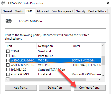 Si obtiene algún tipo de error, como el que se muestra a continuación, al intentar configurar el puerto, probablemente se deba a que está configurado como un puerto WSD .