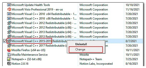 - ahora elige Paquete redistribuible de Microsoft Visual C ++ 2015-2019 (x64) y presiona Cambio Como se muestra abajo.