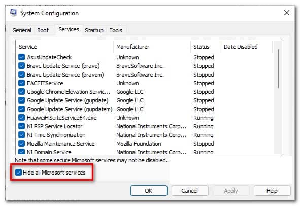 - Marque la casilla junto a él Esconder todos los servicios de Microsoft y luego haga clic en el botón apagar todo.