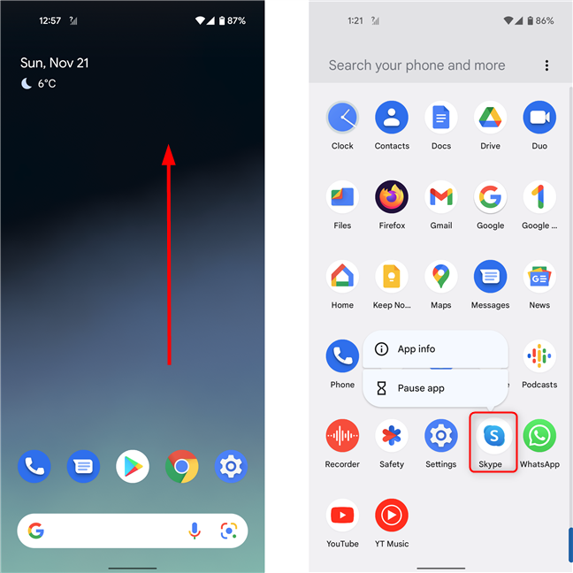 Lo primero que hacemos en un nuevo smartphone, tras cambiar el fondo de pantalla y elegir un nuevo tono de llamada, es añadir los accesos directos a nuestras apps favoritas a la pantalla de Inicio(Home screen) . Para agregar un nuevo acceso directo a la aplicación(app shortcut) en su pantalla(Home screen) de inicio en Android 12 , comience abriendo la pantalla Todas las aplicaciones(All Apps) . Para hacer eso, deslice hacia arriba en la pantalla(Home screen) de inicio . En otros teléfonos inteligentes Android , es posible que deba tocar el botón Todas las aplicaciones(All apps) (su ícono generalmente parece una matriz(dot matrix) de puntos ). Luego, toque y mantenga presionado el ícono de la aplicación que desea agregar a la pantalla(Home screen) de inicio . La aplicación debería comenzar a flotar, siguiendo tu dedo.