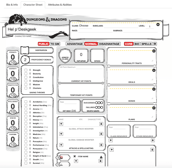 El primer paso en cualquier campaña DND (después de unirse a la campaña en sí) es crear un personaje. A los efectos de este artículo, asumiremos que sabe cómo tirar los dados y distribuir las estadísticas. El propósito de este tutorial de Roll20 será mostrarle cómo implementarlo todo en la hoja de personaje de Roll20 .