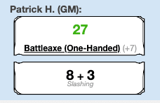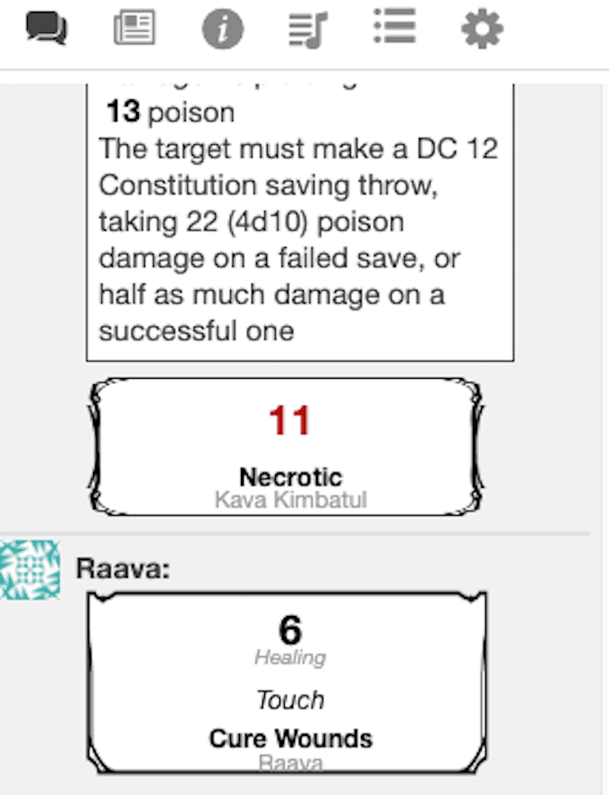 Rueda(Roll) y ataca haciendo clic en el nombre del arma. Lo verá aparecer en el lado derecho de la pantalla si hace clic en el icono de mensaje. El número superior es la tirada de ataque(Attack Roll) para determinar si aciertas o fallas. El número inferior es la cantidad de daño que infliges con el ataque.
