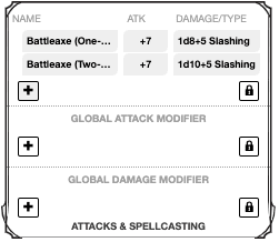 Desde allí, seleccione Elementos. (Items.)Puede desplazarse por esta lista y arrastrar el equipo más básico que tendrá en el nivel uno. En este ejemplo, le hemos dado a nuestro mago(Wizard) un hacha(Battleaxe) de batalla . Debido a que hay dos formas diferentes de atacar con Battleaxe , Roll20 ha agregado ambas opciones al menú Ataques y lanzamiento de hechizos.(Attacks & Spellcasting )