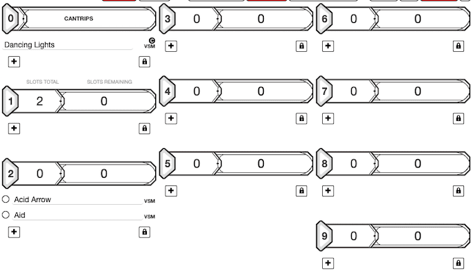 Otra parte vital de D&D es el lanzamiento de hechizos. En la parte superior derecha de la hoja de tu personaje hay tres pestañas: Núcleo, Biografía(Core, Bio, ) y Hechizos. ( Spells. )Selecciona Hechizos(Select Spells) y verás una página como la siguiente.