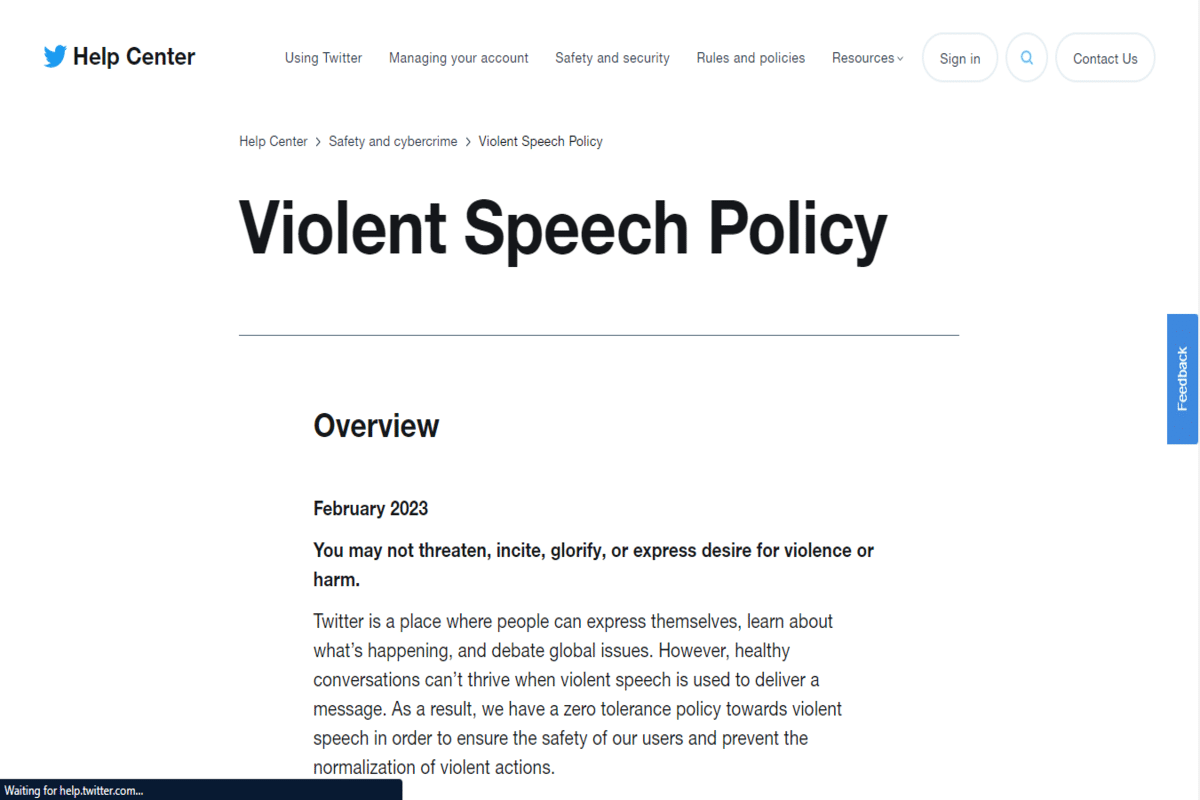 “Twitter es un lugar donde las personas pueden expresarse, enterarse de lo que sucede y debatir temas globales. Sin embargo, las conversaciones sanas no prosperan cuando se utiliza un discurso violento para transmitir un mensaje. Como resultado, tenemos una política de tolerancia cero hacia el discurso violento para garantizar la seguridad de nuestros usuarios y evitar la normalización de acciones violentas.”, lee el funcionario Centro de ayuda de Twitter.