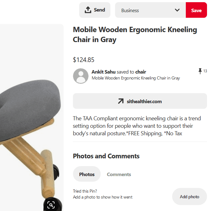 Como puede ver en la imagen de arriba, los pines(Pin) pueden contener detalles como el precio, una descripción, un enlace a dónde comprar la silla, un lugar para comentar y la capacidad de enviar el pin a uno de sus propios tableros.