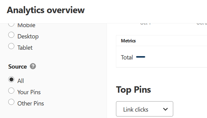 Pines principales(Top Pins) : para determinar su mejor contenido en Pinterest a lo largo del tiempo, mire sus Pines principales(Top Pins) . Puedes analizar tus pines principales en función de: