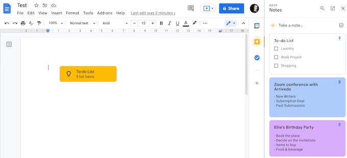 Zamiast, Google Keep najlepiej nadaje się dla każdego, kto poświęca dużo czasu na pracę Dokumenty Google . Możesz przeciągać i upuszczać swoje notatki z Google Keep bezpośrednio na Twoich dokumentach pod adresem Dokumenty Google . Nie możesz zrobić tego samego z Zadania Google .