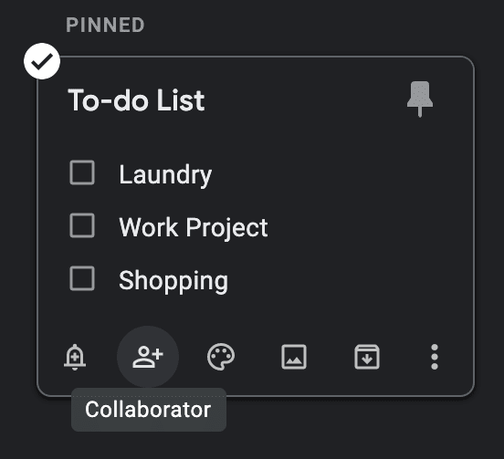 Aby udostępnić swoją kartę Google Keep zlokalizuj go na tablicy zadań Google Keep i wybierz ikonę (Google Keep)Współpracownik(współpracownik) na dole.